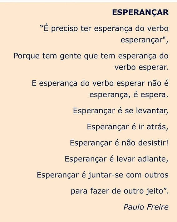 Seja bem-vindo 2020! E que tenhamos esperança do verbo esperançar, como nos ensinou Paulo Freire.
